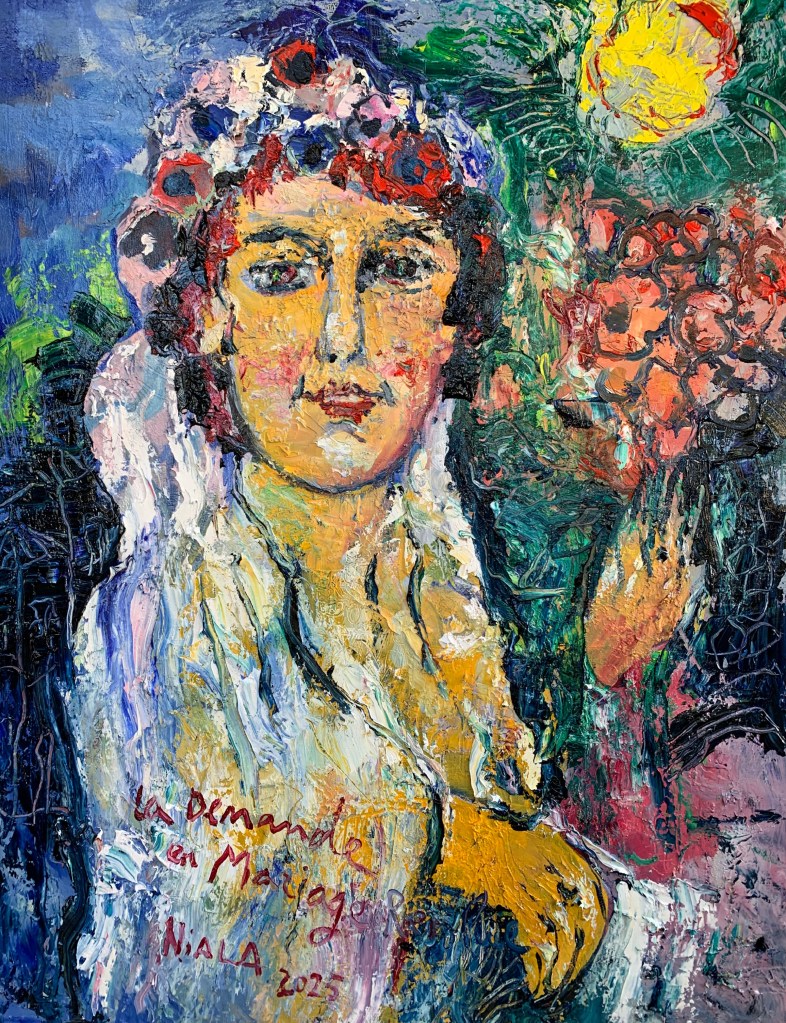 Et je sens LA DEMANDE EN MARIAGE, comme on ferme sa valise, prêt à partir, pleine. Ce tableau refuse intrinsèquement de finir, à peine signé je le reprends. Ballade des aiguilles de la pendule qui tricotent la maille.